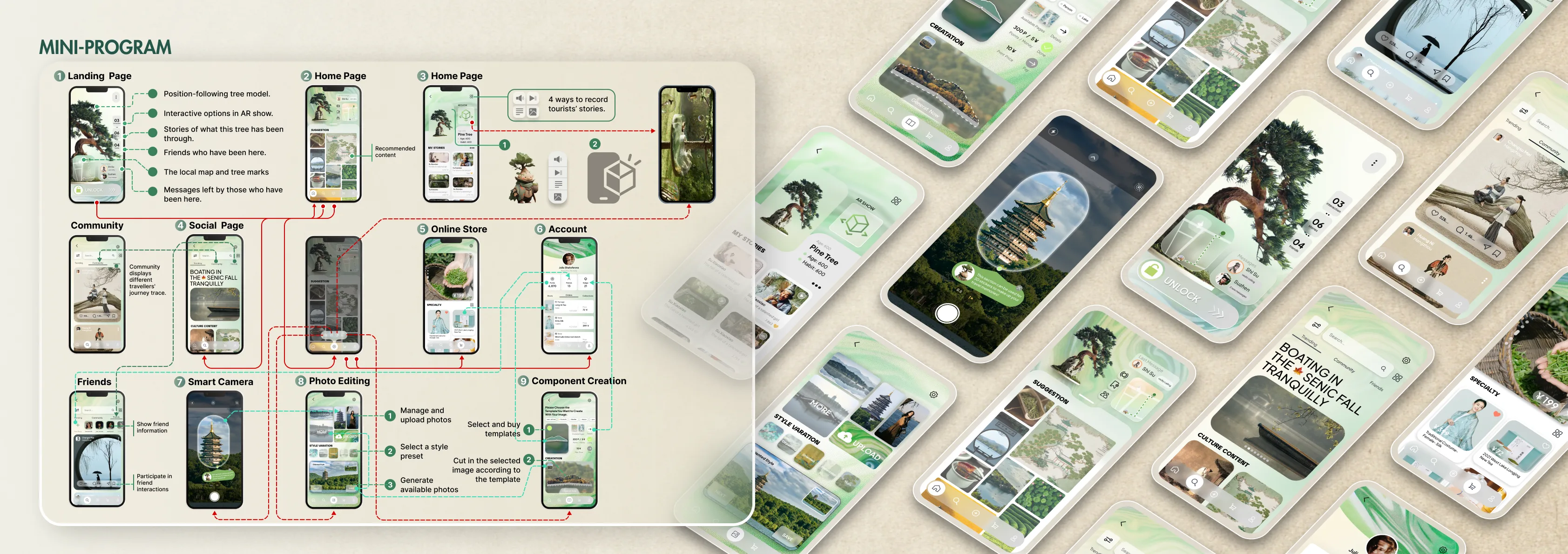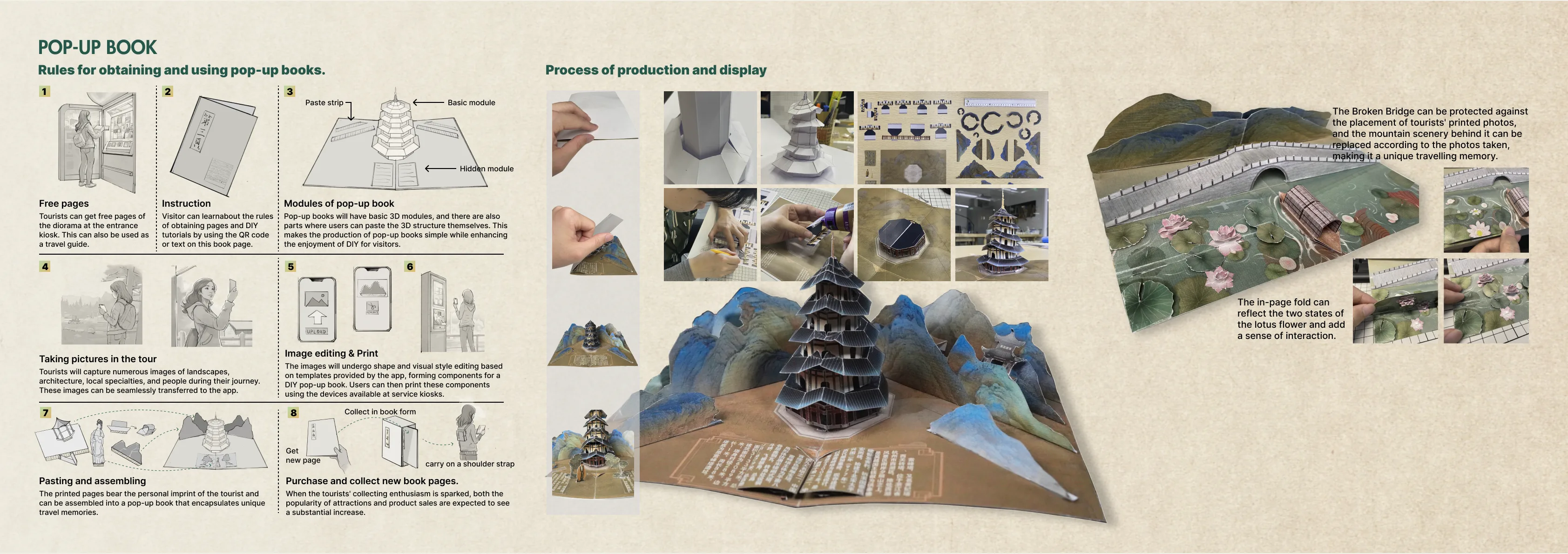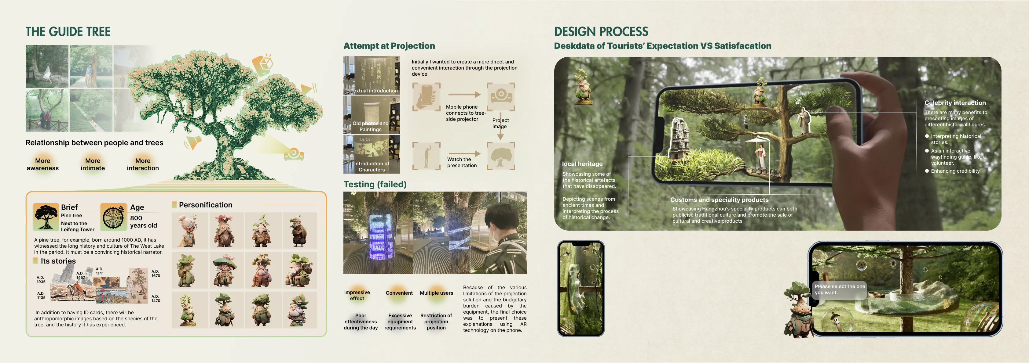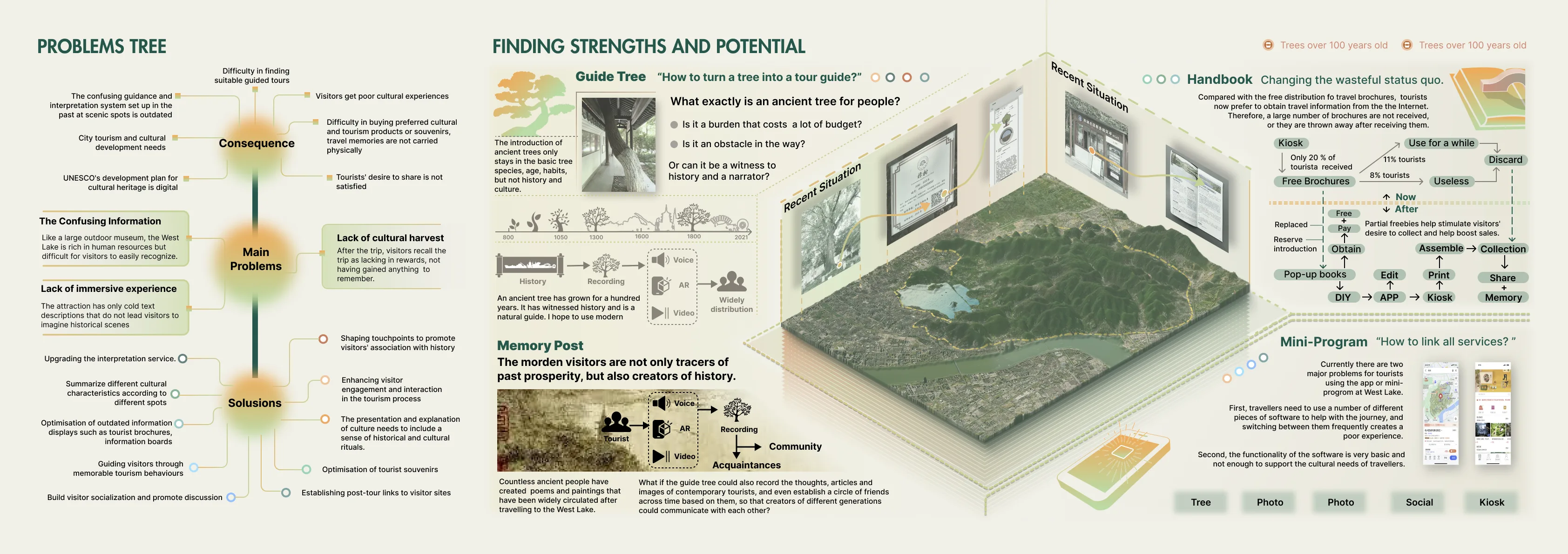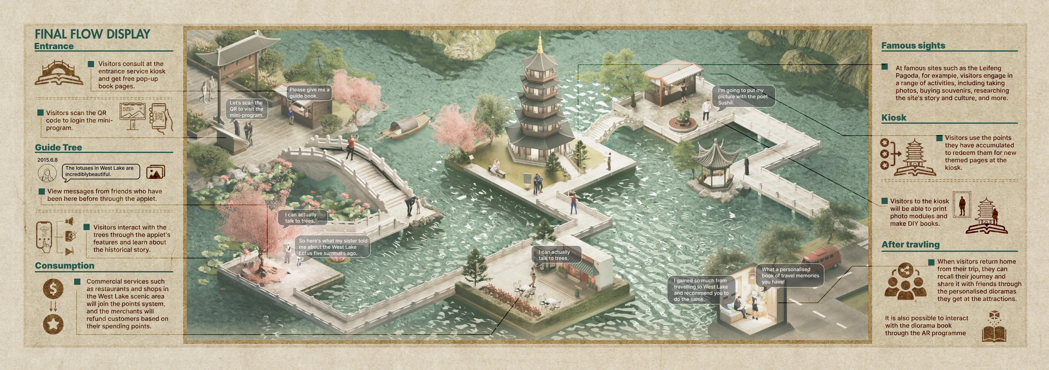 Exploring the cultural experience of historical and cultural tourist places through the experience design of West Lake scenic area, Hangzhou. The project addresses the gap between tourist expectation and satisfaction by designing an integrated system of AR guide trees, a mini-program, pop-up books, and kiosks.