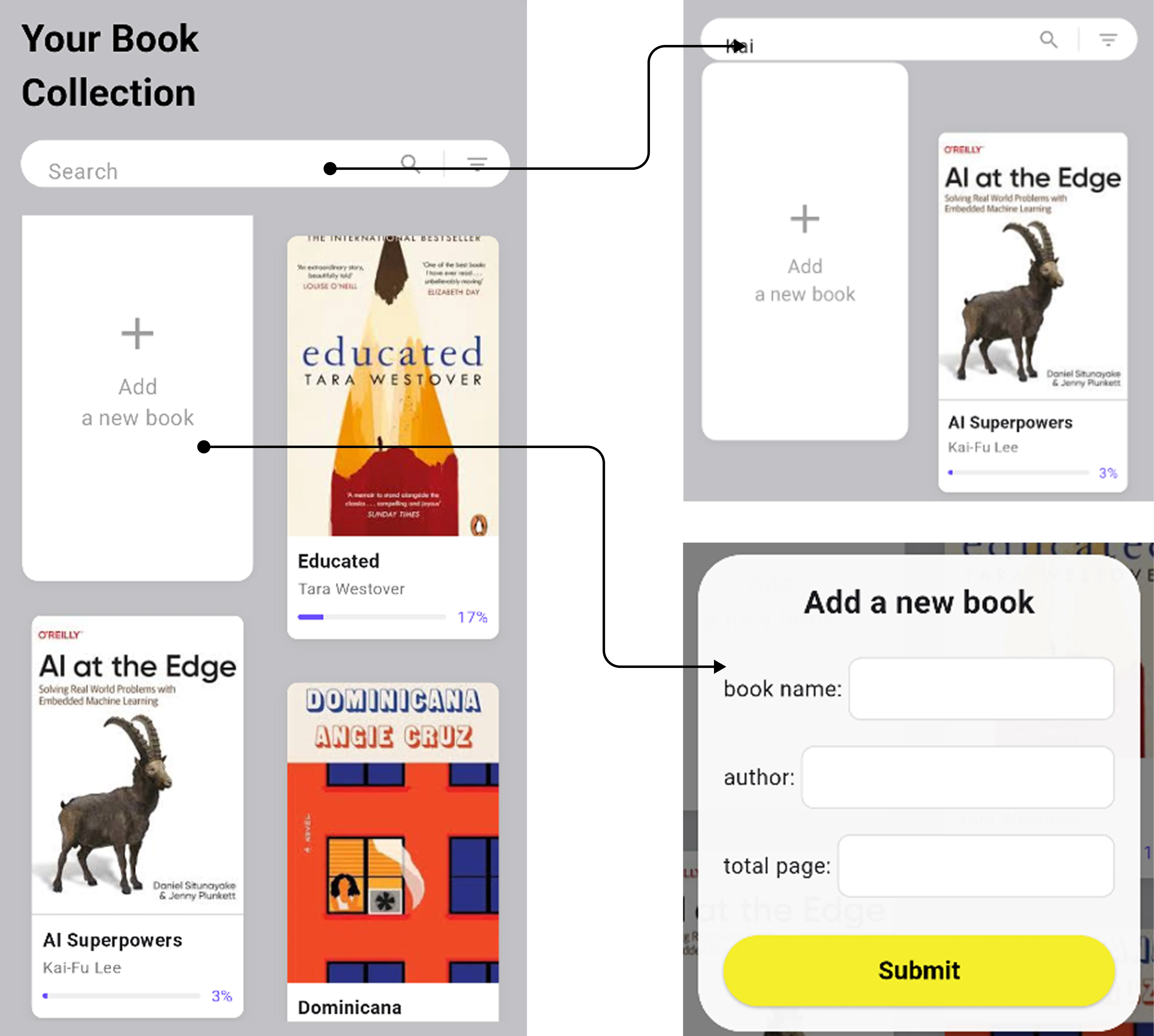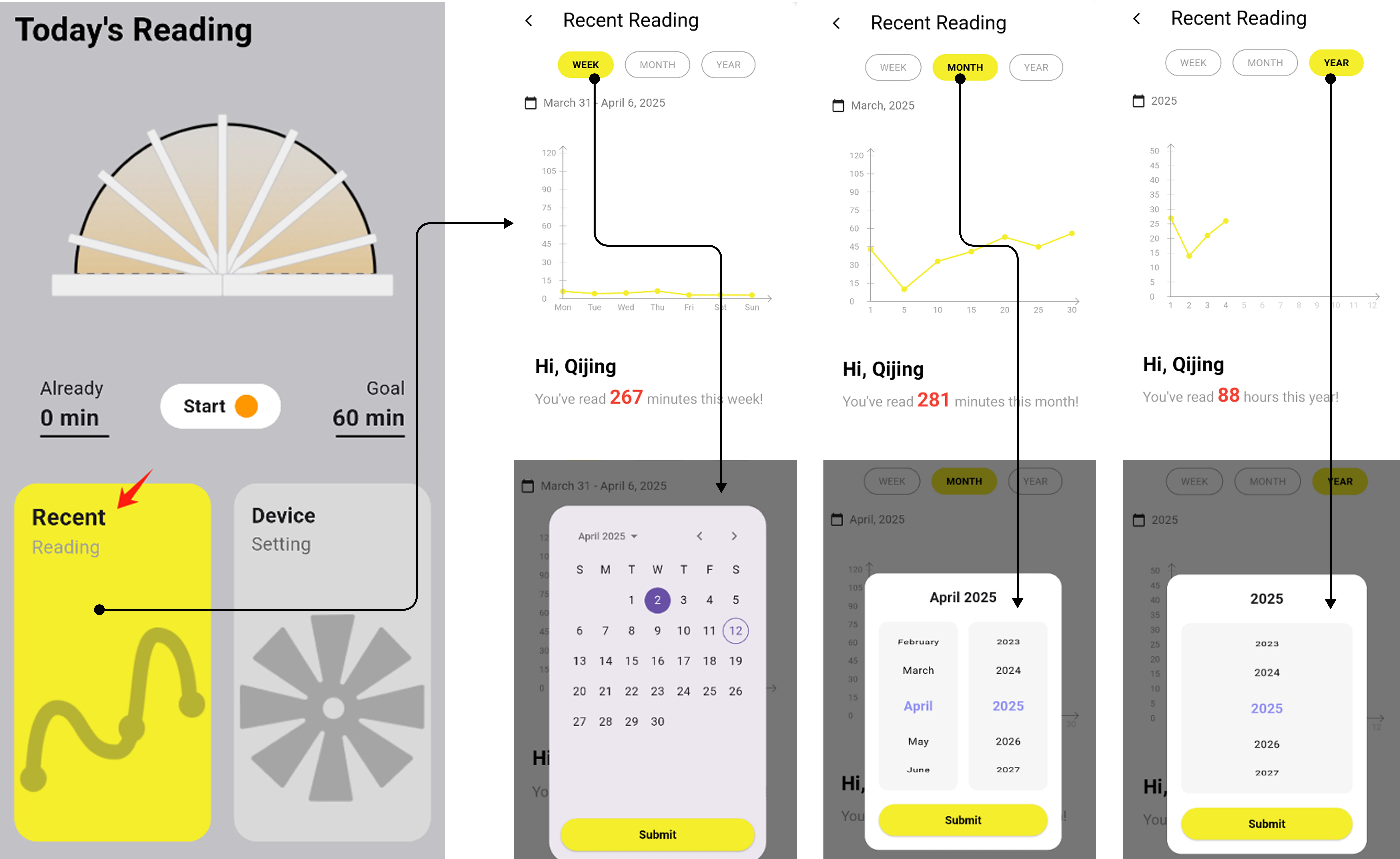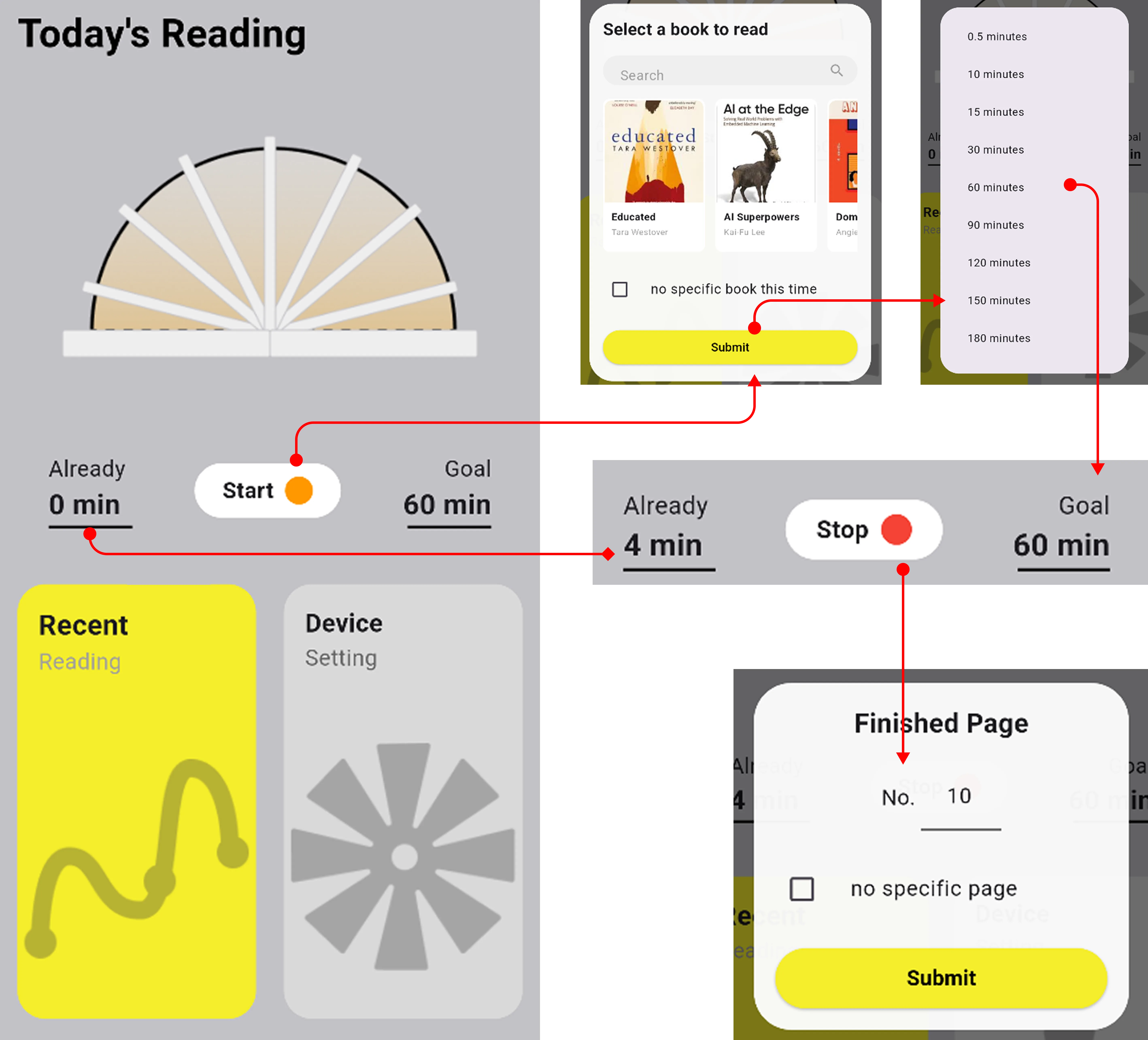 The companion Flutter app brings reading data to life. Log sessions and page counts during reading, review weekly and monthly statistics, manage your personal library, and join reading groups to compare progress with friends.